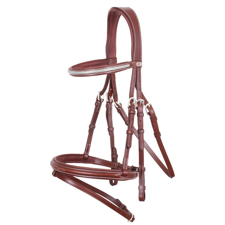 Elegant träns i italienskt läder med stilrena vita sömmar, silverspännen, klassiskt pannband med snygga klinkers och kombinerad paddad nosgrimma med smakfull mönstersömnad.