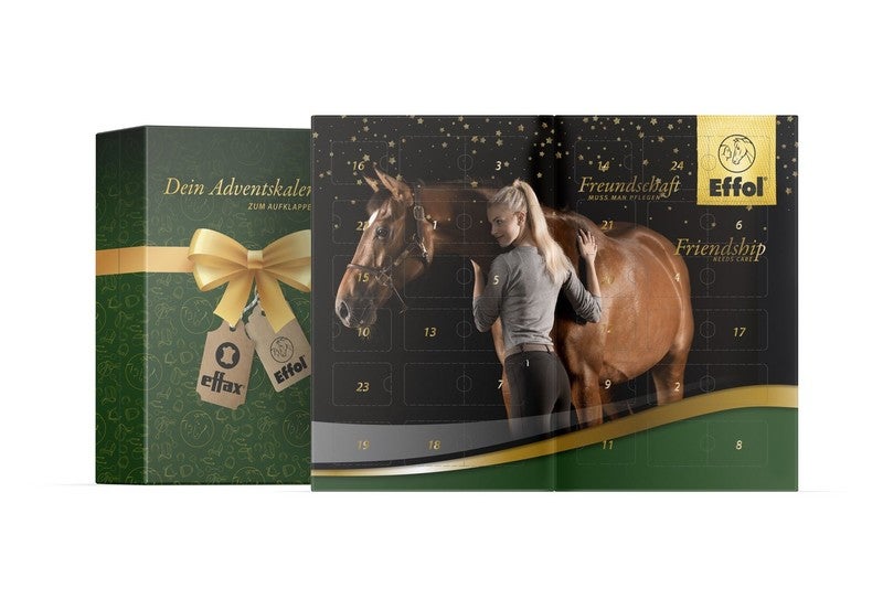 Joulukalenteri, jonka luukkujen yllätykset ovat hyödyllisiä ja laadukkaita Effol & Effax tuotteita minikoossa, sekä hevosen karvan-, ihon- ja kavionhoitoon kuin tuotteita myös ratsastajalle.