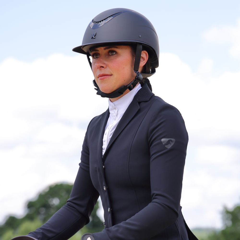 - Tyylikäs mattapintainen ratsastuskypärä – Sävysävyinen Ellipse-kehys koristeena.