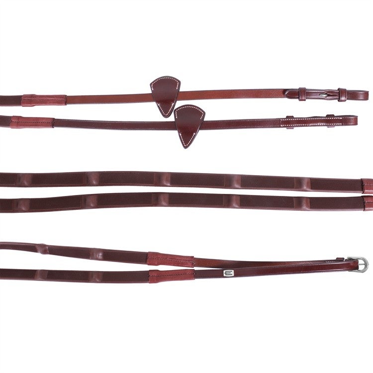 Erittäin laadukkaat Soft Grip kumiohjat italialaista nahkaa kohotetuilla stoppareilla, valkoiset ompeleet ja hopeiset piilosoljet. Ohjissa on tyylikäs E-logo.