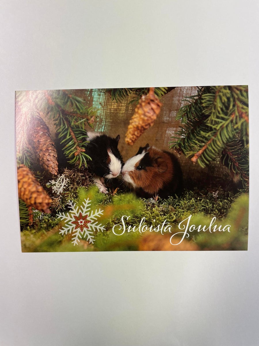 Villikkäät kotimaiset eläinaiheiset joulukortit, joissa joulutoivotus usealla eri kielellä. Isohkossa kortissa on hyvin tilaa myös omille joulutoivotuksille.